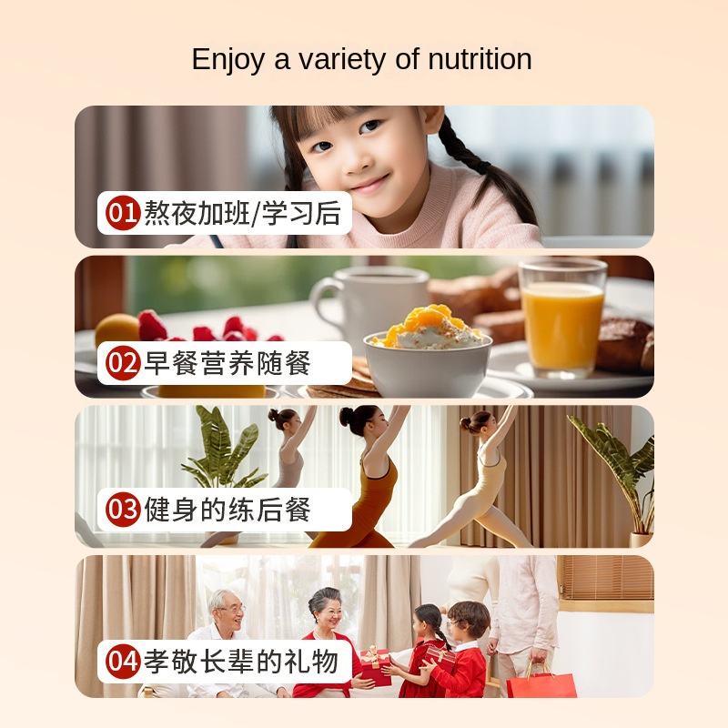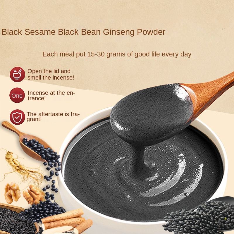 ginseng pulverate, walnut kernel, Chinese yam, black soya bean, black sesame, oats, black kerneled riceส่วนผสมหลัก