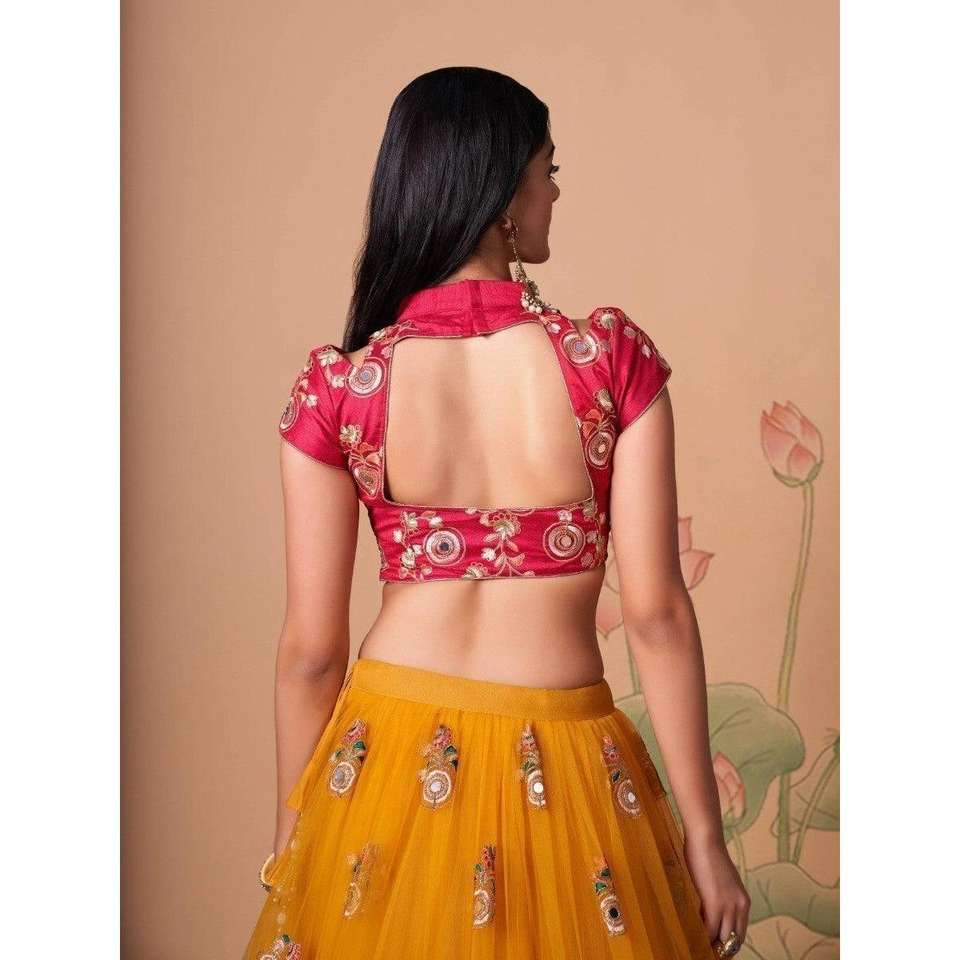 Lehenga choli เลฮิงกาการับตาข่ายกระจกสีเหลือง