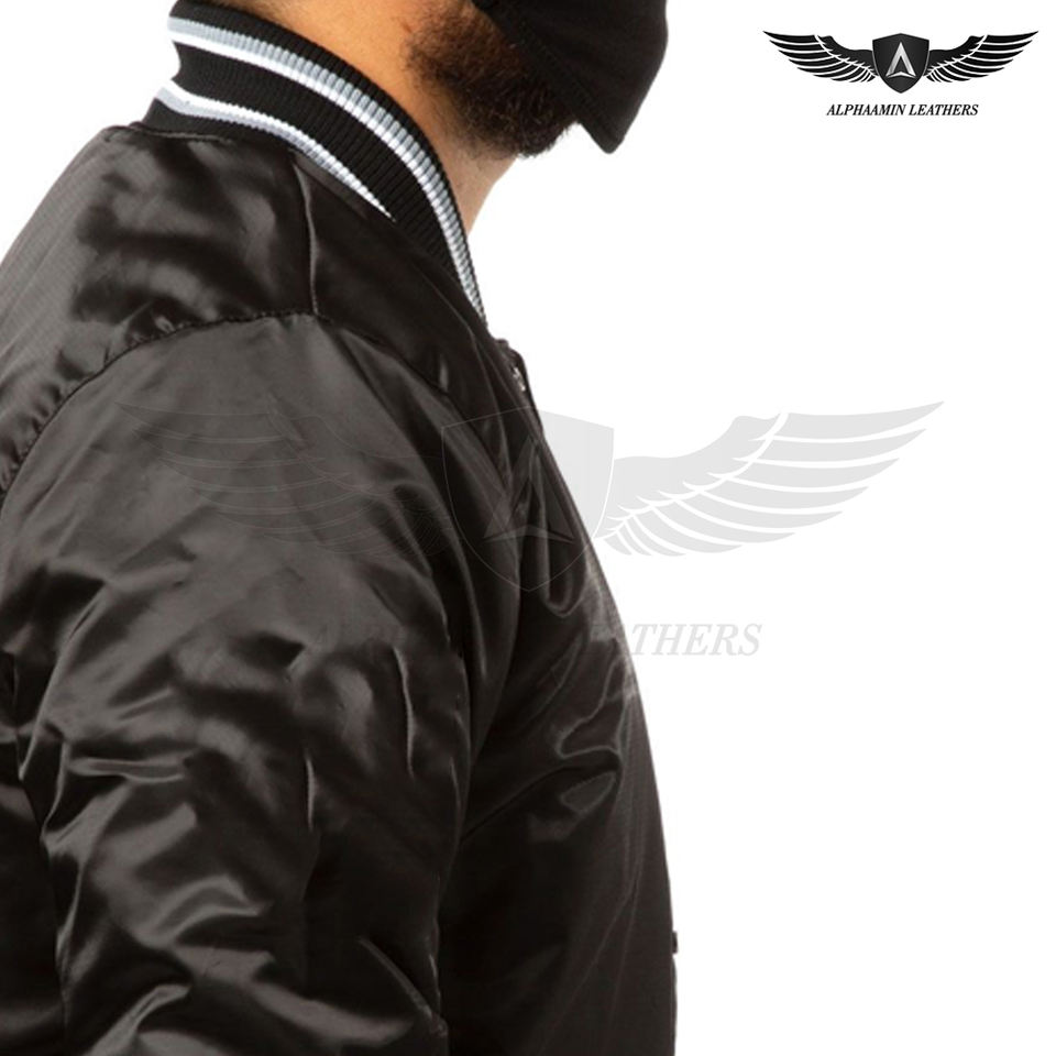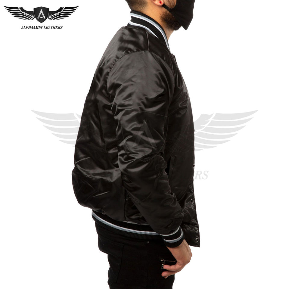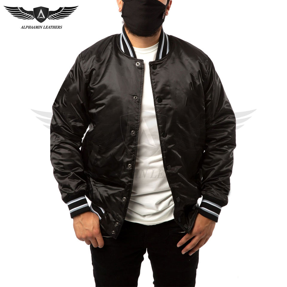แจ็กเก็ตผ้าซาตินสไตล์วินเทจสำหรับผู้ชายเสื้อแจ็กเก็ตผ้าซาตินสีทึบสีดำเดียว