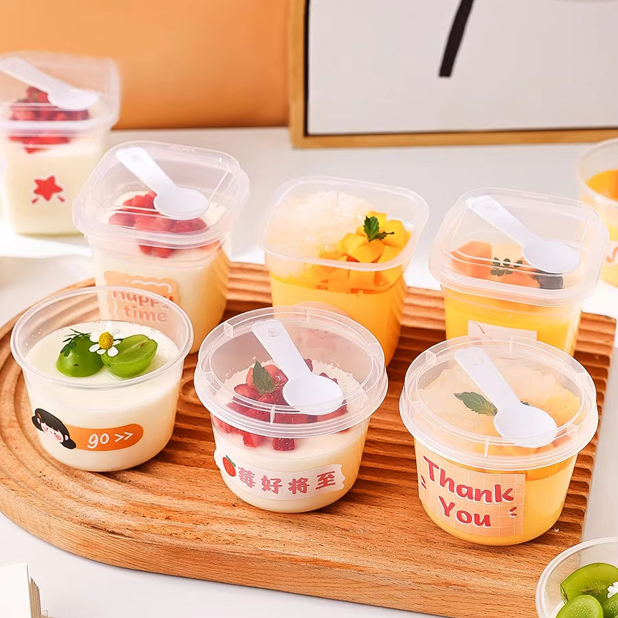 กล่องเค้กนมเยลลี่พุดดิ้งโยเกิร์ตอบ220มล. 260มล. โถพลาสติก PP ถ้วยขนมหวานพร้อมฝาและช้อน