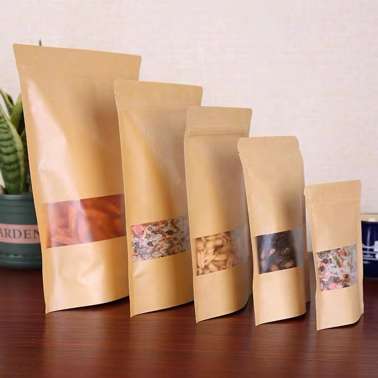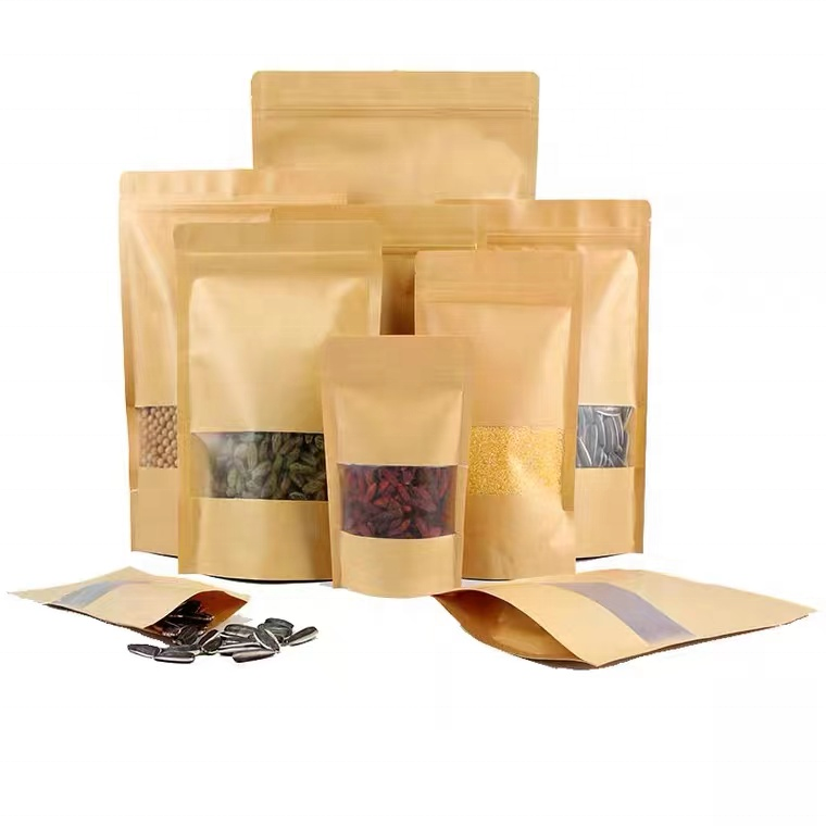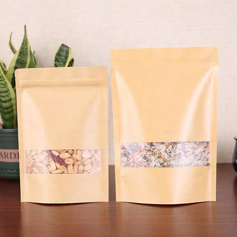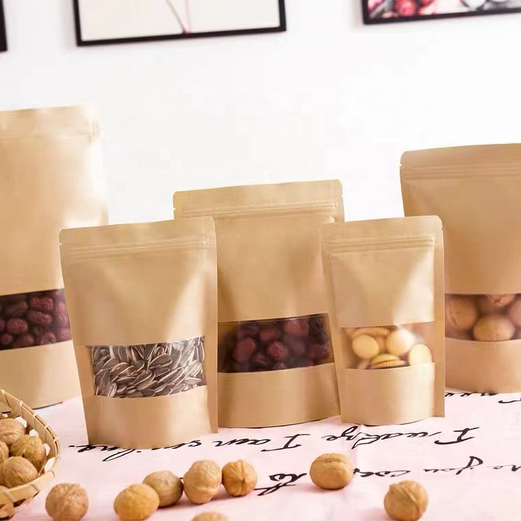 ถุงยืนขึ้นถุงที่มีหน้าต่างลูกอมคุกกี้บรรจุภัณฑ์กระดาษคราฟท์ถุงอาหารถั่วถุง Ziplock