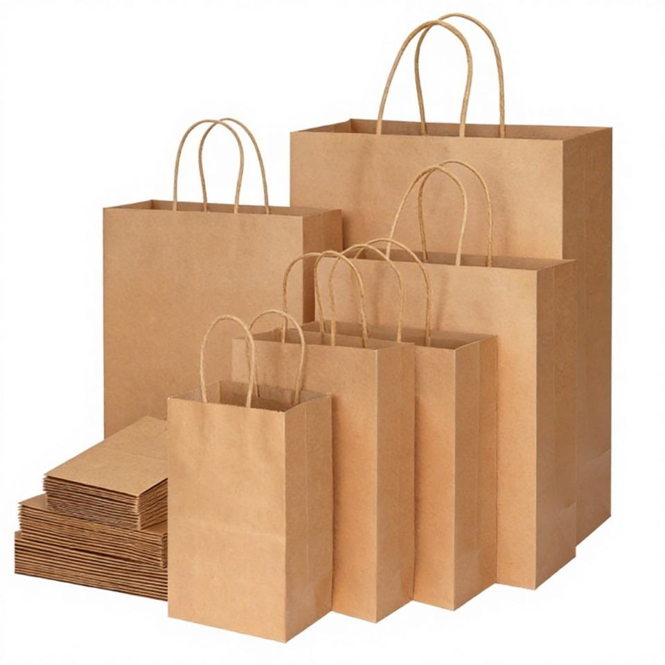 ถุงกระดาษคราฟท์สีน้ำตาลแบบกำหนดเอง ย่อยสลายได้ นำกลับมาใช้ใหม่ได้ พร้อมหูหิ้วแบบไดคัท สำหรับบรรจุภัณฑ์อาหาร มีสินค้าในสต็อก