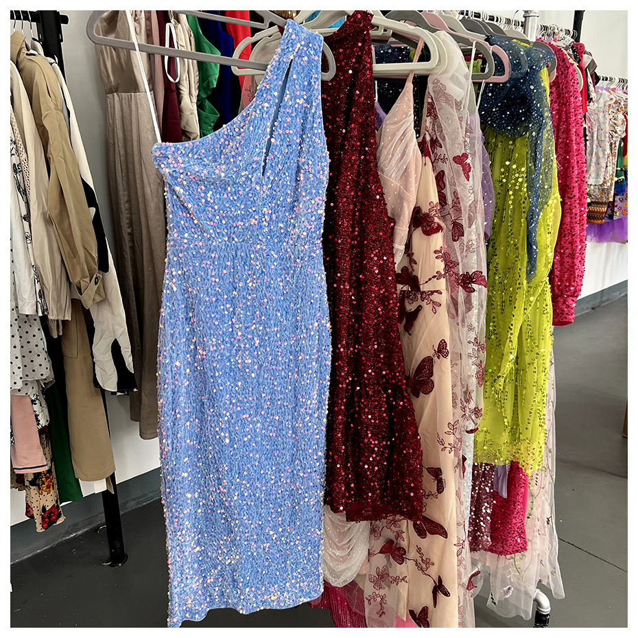 ชุดเดรสออกงานสำหรับผู้หญิงชุดเดรสหรูพิมพ์ลายกากเพชรคอวีสายสปาเก็ตตี้แบบลื่น