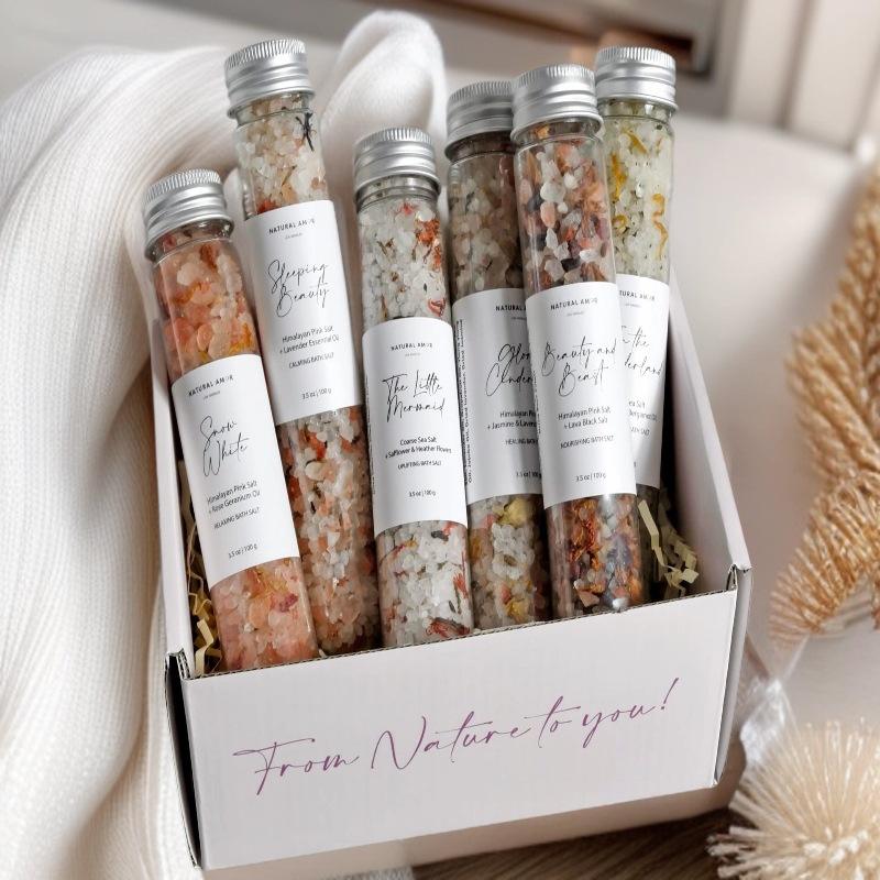 เกลืออาบน้ำหิมาลัยพร้อมดอกไม้แห้ง บรรจุขวดสีพื้น รูปทรงหลอดทดลอง มีสินค้าในสต็อก