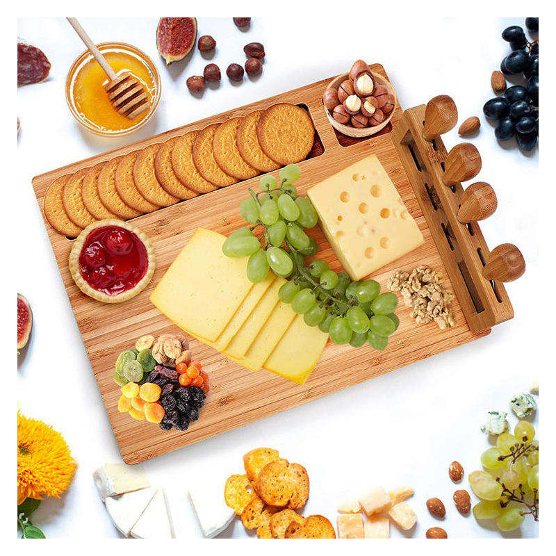 ชุดมีดไม้ไผ่ 4 ชิ้น พร้อมถาดเสิร์ฟชีสสำหรับงานปาร์ตี้ มีสินค้าในสต็อก