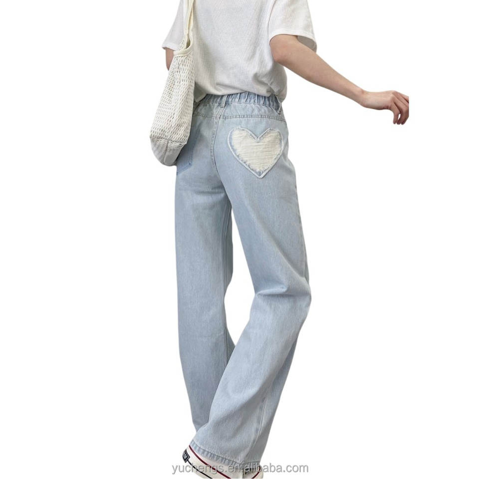 กางเกงยีนส์ขาบานสำหรับผู้หญิงกางเกงยีนส์ทรงหลวมมีกระเป๋ารูปหัวใจสำหรับผู้หญิงผ้าพรีเมียมสไตล์เกาหลี