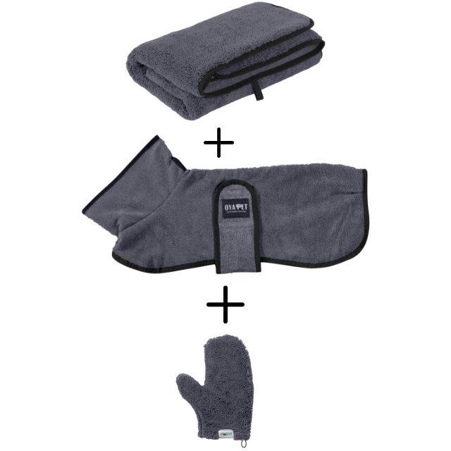 ชุดคลุมอาบน้ำสุนัขไมโครไฟเบอร์ผลิตในตุรกีชุดดูแลสัตว์เลี้ยง3 in 1พร้อมผ้าขนหนูและถุงมือเสื้อโค้ทดูดซับแห้งเร็ว