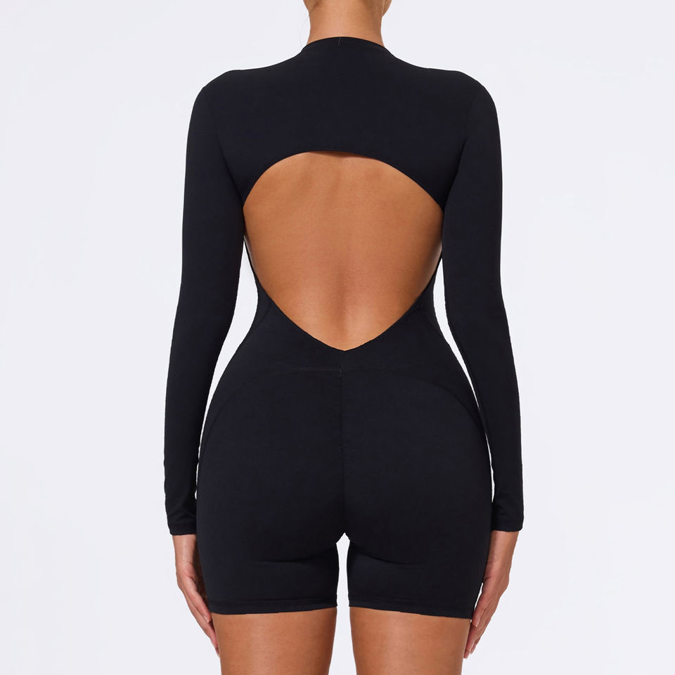 จั๊มสูทออกกำลังกายแบบเรียบง่าย ยกกระชับสะโพก ดีไซน์เว้าหลัง คอตั้ง ซิป พร้อมแผ่นรองหน้าอก ลายเส้นแยกชิ้น