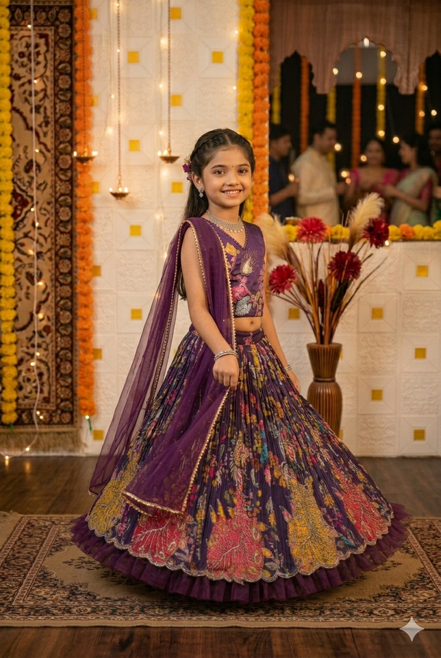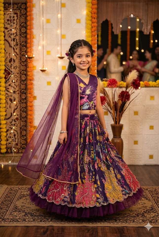ชุดอินเดีย-ปากีสถานสุดฮิต ลายพิมพ์นกยูงแบบดั้งเดิม ชุดสาหรี่กะมีซ ผ้าเครปคุณภาพสูง ชุดเด็กผู้หญิงสไตล์ชาติพันธุ์