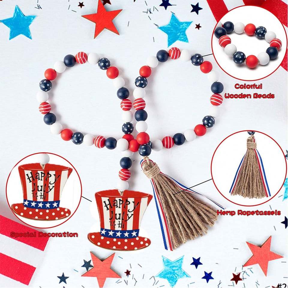 อิสระวันรักชาติทำด้วยมือพวงมาลัยลูกปัดไม้แบบชนบทพร้อมพู่สำหรับถาดฉัตรและของแขวนติดผนัง