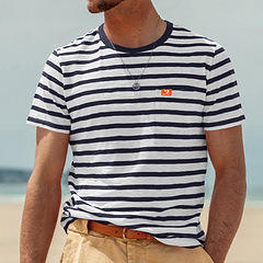 เสื้อยืดแขนสั้นลายทางสำหรับผู้ชาย คอกลม สไตล์ลำลองสำหรับฤดูร้อน ผ้าบาง ลายพิมพ์ ผ้าฝ้าย 91-95% มีสินค้าในสต็อก