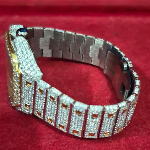 ผู้ผลิตนาฬิกาอินเดีย นาฬิกาควอตซ์สแตนเลสสตีลหรูหราไฮเอนด์ ประดับเพชรโมอิสซาไนต์ สำหรับผู้ชาย ออกแบบเองได้ สไตล์ฮิปฮอป เครื่องประดับทองชมพู สายหนัง สำหรับนักธุรกิจ