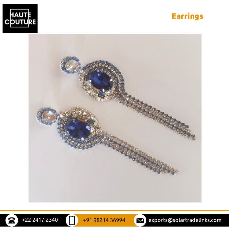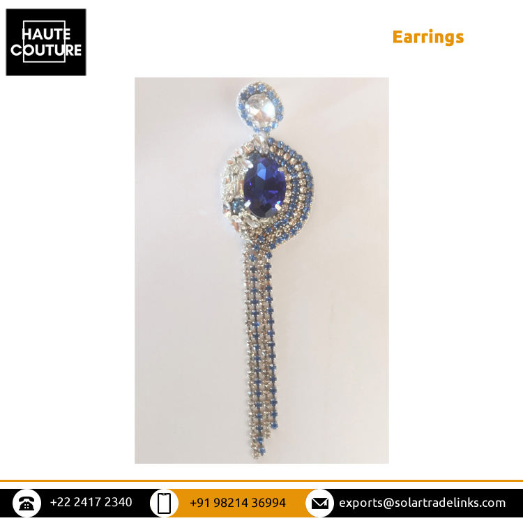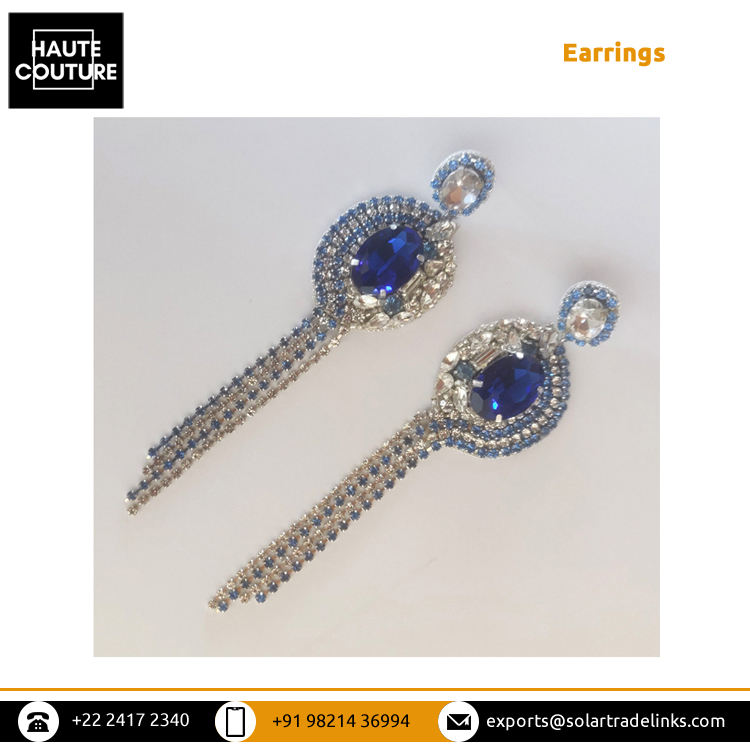 พู่แซฟไฟร์สีน้ำเงินสำหรับผู้หญิง,ตุ้มหูแบบห้อยยาว5นิ้วปักด้วยมือดีไซน์แฟนซีจำหน่ายโดยอินเดีย