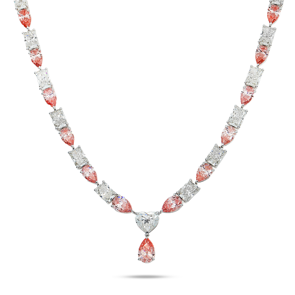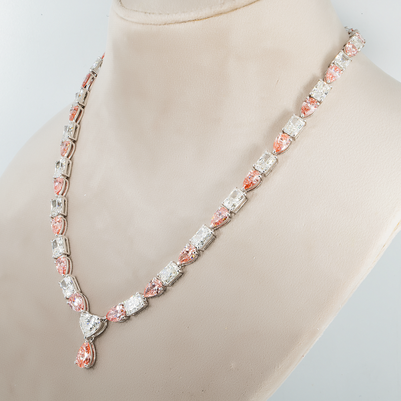 สร้อยคอเพชรทรงหยดน้ำสีชมพูแฟนซีเจียระไนแบบเรเดียนท์และทรงลูกแพร์ ทองคำขาว 14K จากซัพพลายเออร์อินเดีย สำหรับเครื่องประดับเจ้าสาวงานแต่งงาน จำหน่ายในปริมาณมาก