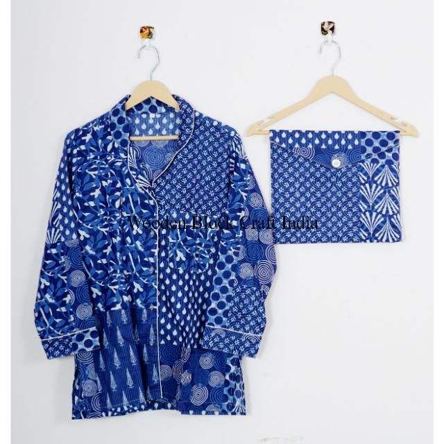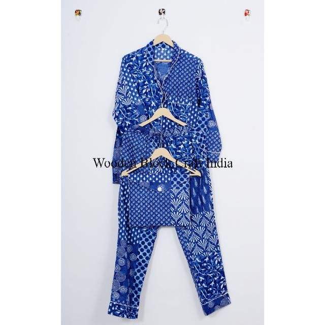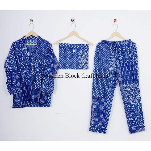 ชุดนอนผ้าฝ้ายพิมพ์ลายบล็อกอินเดีย 100% ชุดเพื่อนเจ้าสาว ชุดนอนผู้หญิง ชุดเสื้อกางเกงผ้าฝ้าย