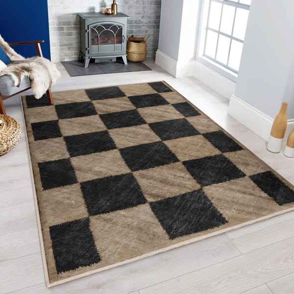 พรมลายตารางแบบอินเดียสำหรับห้องนั่งเล่น พรมขนาดใหญ่สีดำและสีเบจ ลายตารางหมากรุก กันลื่น ซักได้ ผลิตจากโพลีเอสเตอร์