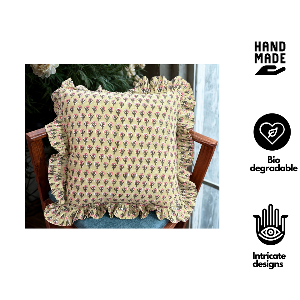 ปลอกหมอนอิงสไตล์โบฮีเมียนแบบจีบจากช่างฝีมืออินเดีย เมืองชัยปุระ ผลิตจากผ้าฝ้ายแท้ เป็นมิตรต่อสิ่งแวดล้อม ปลอดภัยต่อผิวหนัง ซักได้ เหมาะสำหรับใช้ในบ้าน