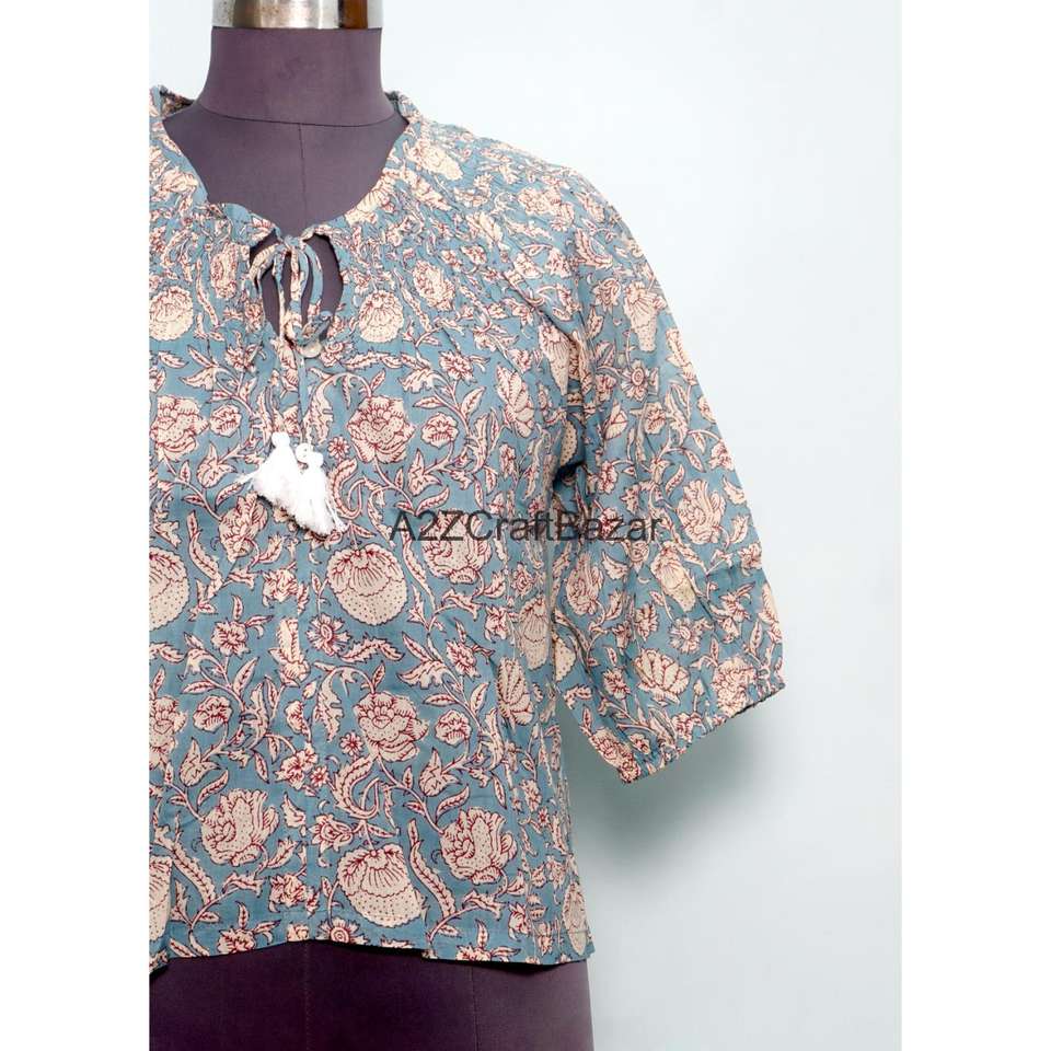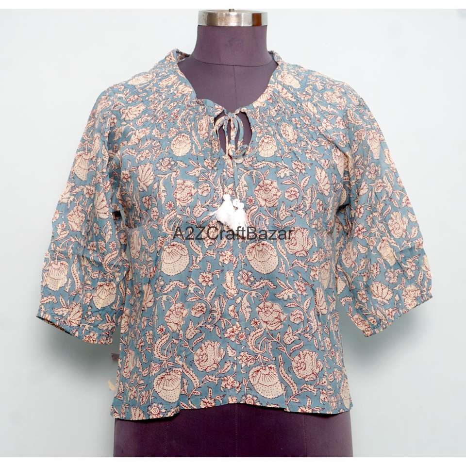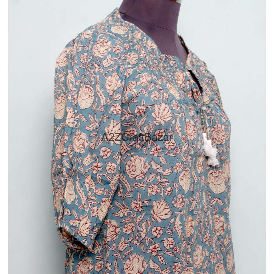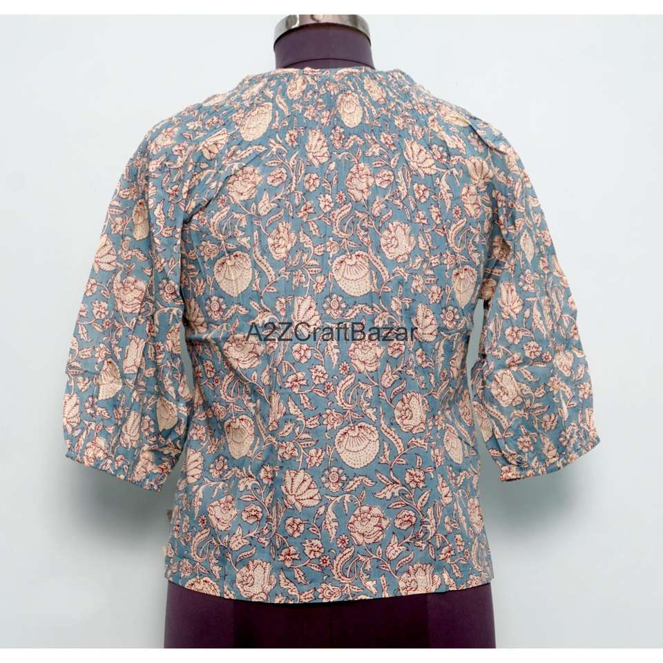 Indian Block Print Casual Non Woven Summer Blouse 100% Pure Cotton Bohemian Floral Design Eco-Friendly Breathable Long Sleeve
