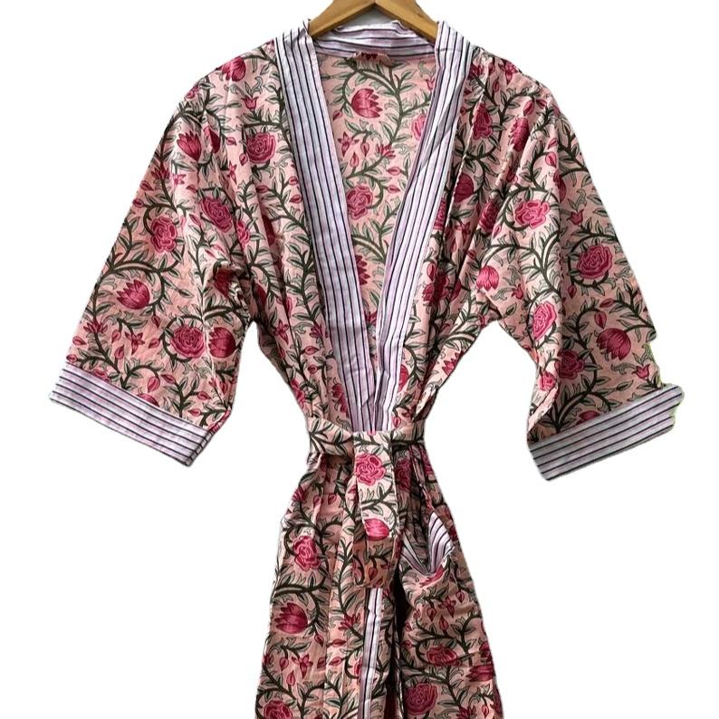 ชุดกิโมโนผ้าฝ้ายพิมพ์ลายดอกไม้สไตล์อินเดีย คอวี แขนยาว น้ำหนักเบา แห้งเร็ว เหมาะสำหรับฤดูใบไม้ผลิและฤดูร้อน
