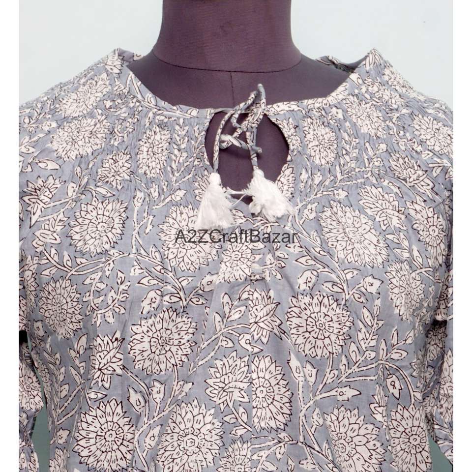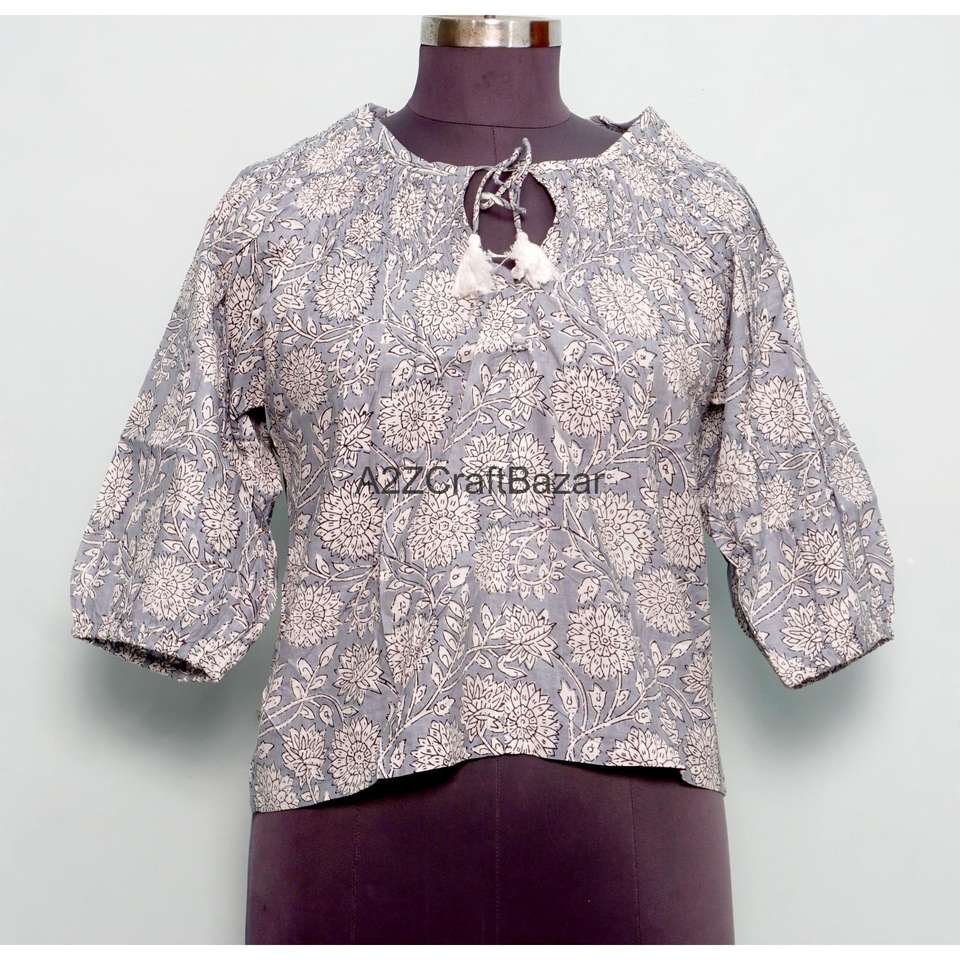 Indian Block Print O-Neck Knitted 100% Pure Cotton Casual Summer Blouse Bohemian Floral Design Eco-Friendly Breathable 3/4