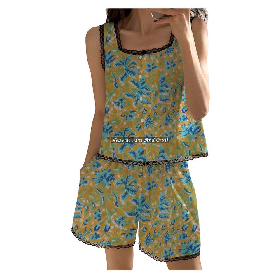 ชุดนอนขาสั้นผ้าฝ้ายพิมพ์ลายบล็อกอินเดีย แต่งขอบลูกไม้ ชุดลำลองฤดูใบไม้ผลิ/ฤดูร้อน ลายดอกไม้ ชุดนอนแขนกุด พิมพ์ลายบล็อก ขายส่ง