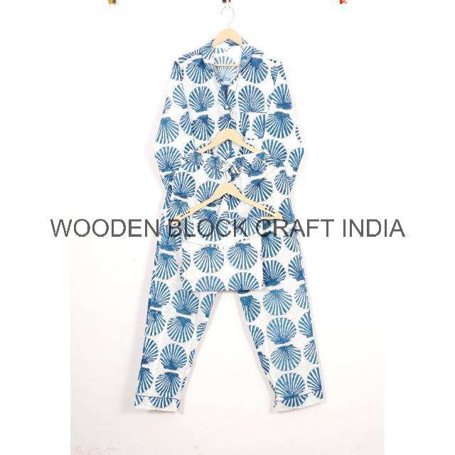 ชุดนอนผ้าฝ้ายพิมพ์ลายเปลือกหอยสำหรับผู้หญิงชุดนอนพิมพ์ลายบล็อกด้วยมือขนาดพิเศษ