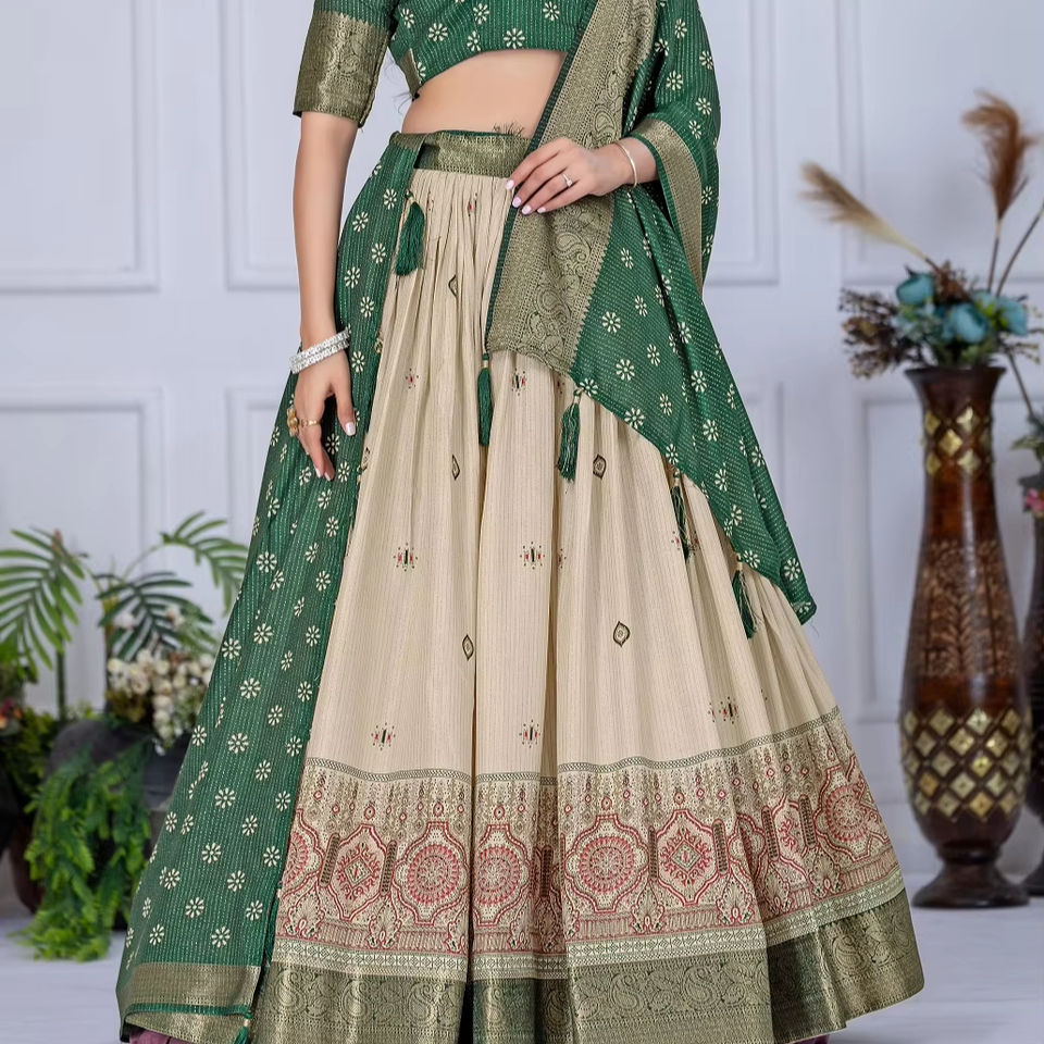 บูติกอินเดียผ้า Lichi ที่มีขอบผ้าแจ็คการ์ดจาริซับในพิมพ์ลาย lehenga choli สูงตามต้องการ