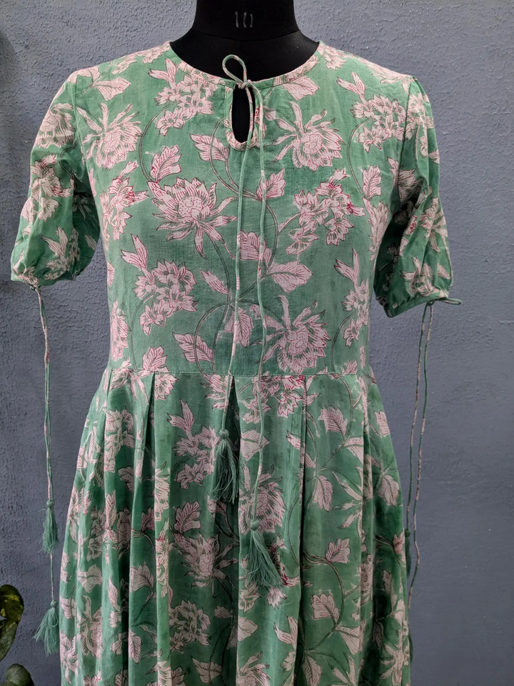ชุดเดรสยาวพิมพ์ลายบล็อกผ้าฝ้ายอินเดีย ชุดเดรสยาวทรงแม็กซี่ แบบยั่งยืน คอจีน แขนพอง ชุดเดรสยาวสำหรับงานปาร์ตี้สำหรับผู้หญิง