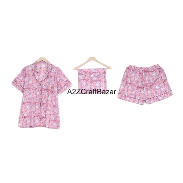 ชุดนอนพิมพ์ลายแบบบล็อกทำจากผ้าฝ้ายอินเดียชุดใส่กลางคืนสำหรับผู้หญิงกางเกงขาสั้นและเสื้อเชิ้ตเรียบสำหรับเพื่อนเจ้าสาว