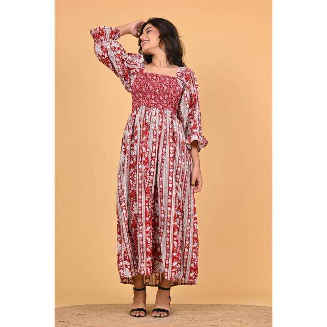 เดรสยาวพิมพ์ลายดอกไม้สไตล์อินเดีย ผ้าฝ้าย แต่งสม็อค แขนยาว สำหรับผู้หญิง เหมาะสำหรับงานปาร์ตี้ฤดูร้อน สไตล์แฮนด์เมด