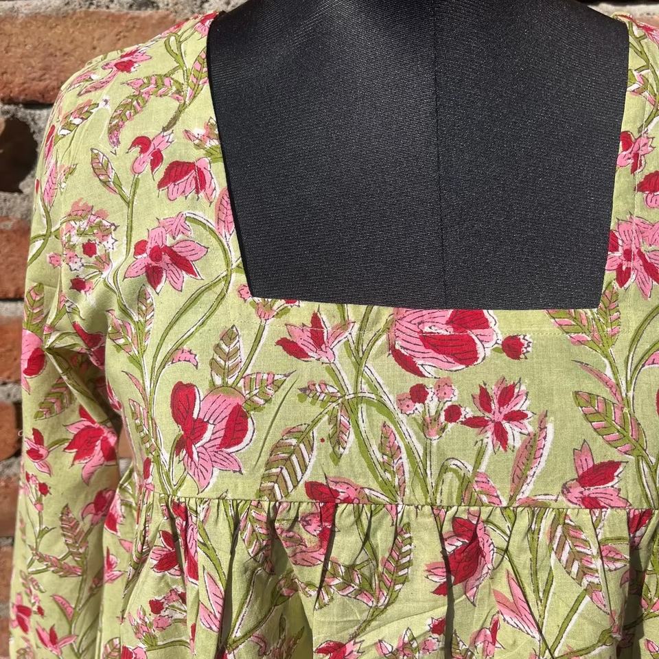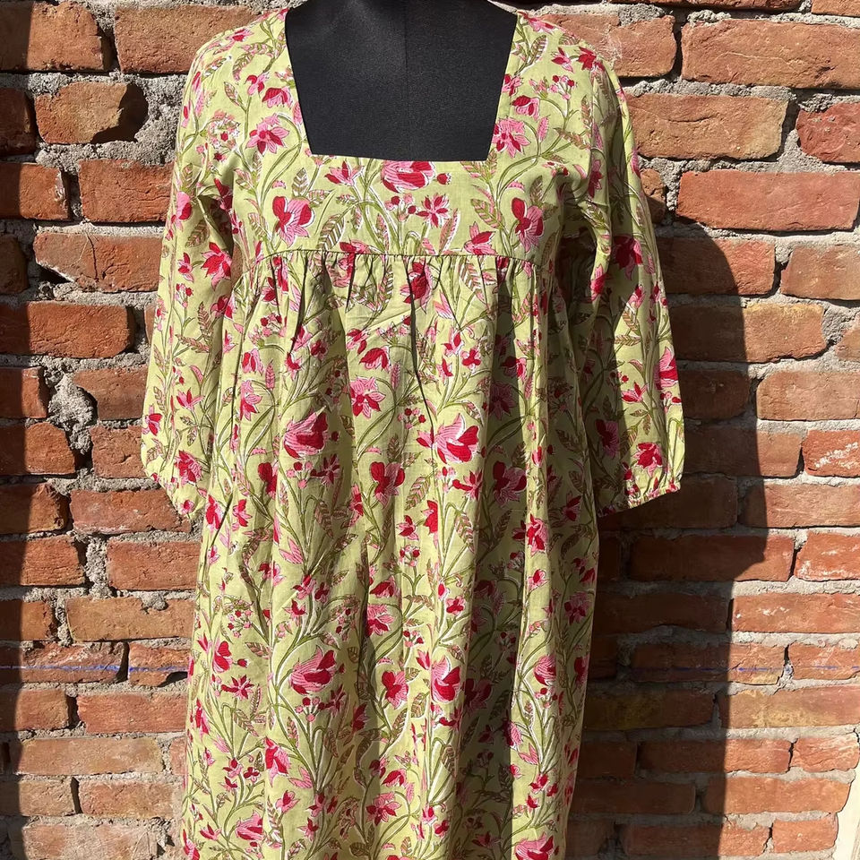 ชุดเดรสผ้าฝ้ายอินเดียพิมพ์ลายบล็อกด้วยมือสำหรับผู้หญิง ความยาวปานกลาง แต่งลายปักดอกไม้ พร้อมลายพิมพ์ดอกไม้