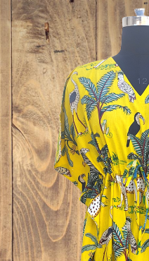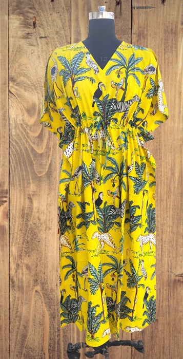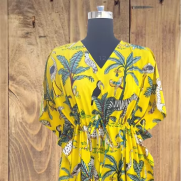 ชุดคลุมผ้าฝ้ายอินเดีย ผ้าฝ้ายแท้ ชุดคลุมฤดูร้อน ลายพิมพ์ป่าสีเหลือง ชุดนอนผู้หญิง ชุดลำลองใส่สบาย คอวี แขนสั้น