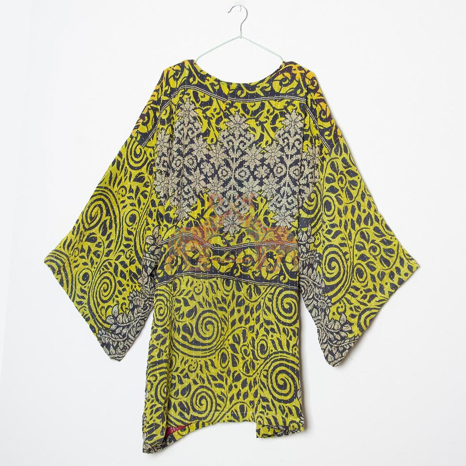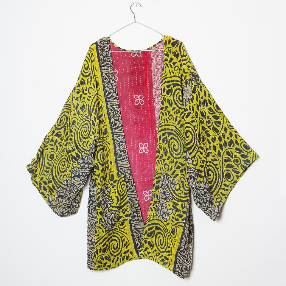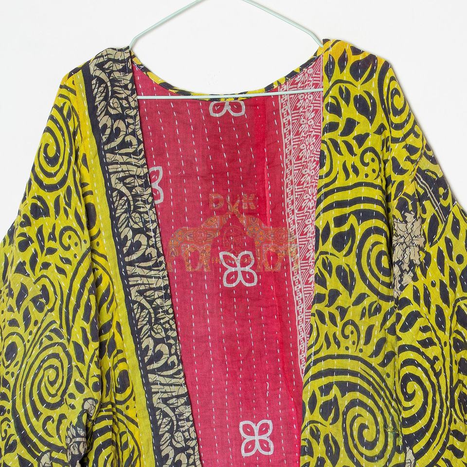 เสื้อคลุมกิโมโนผ้าฝ้ายอินเดียลายปะติดปะต่อแบบคันธา เสื้อคลุมคันธาแบบวินเทจ เสื้อแจ็คเก็ตฤดูใบไม้ร่วงแขนยาวสำหรับผู้หญิง