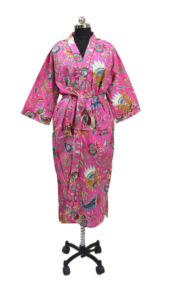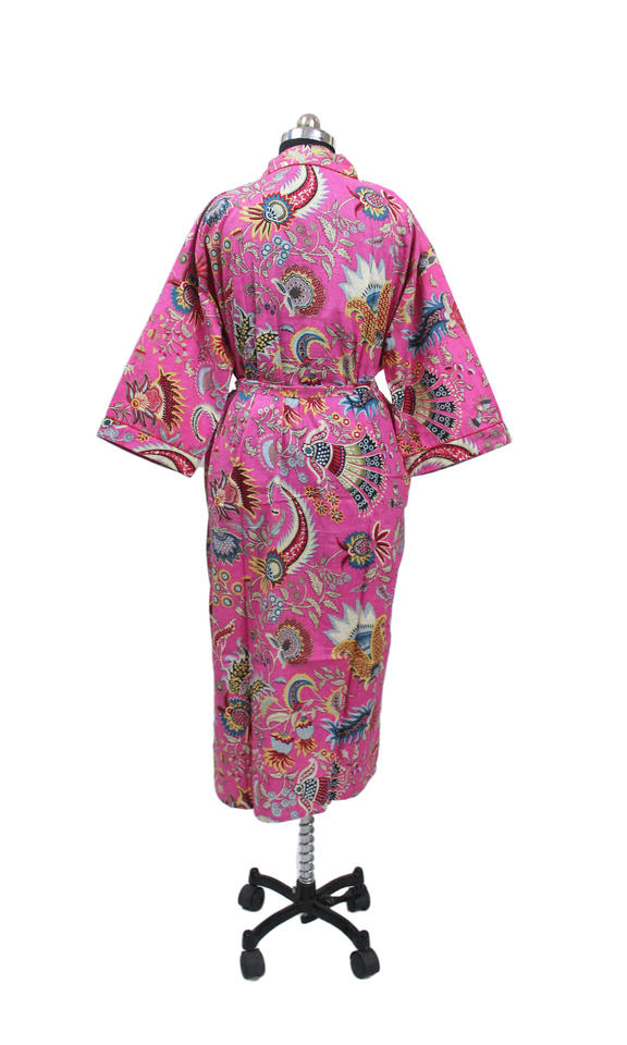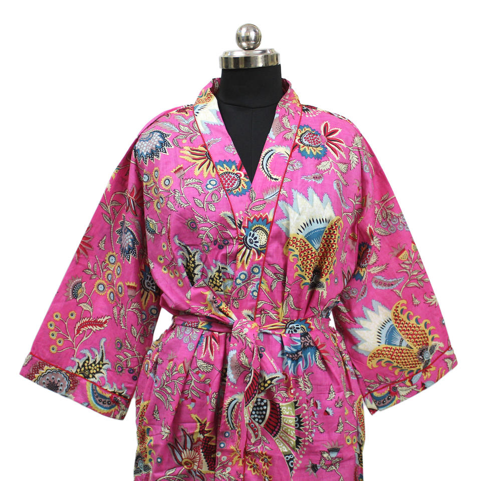 เสื้อคลุมกิโมโนผ้าฝ้ายอินเดียน้ำหนักเบาพิมพ์ลายสีชมพูสำหรับผู้หญิงชุดนอนลำลองฤดูร้อนอาบน้ำอาบน้ำชุดคลุมชายหาดฤดูใบไม้ร่วง