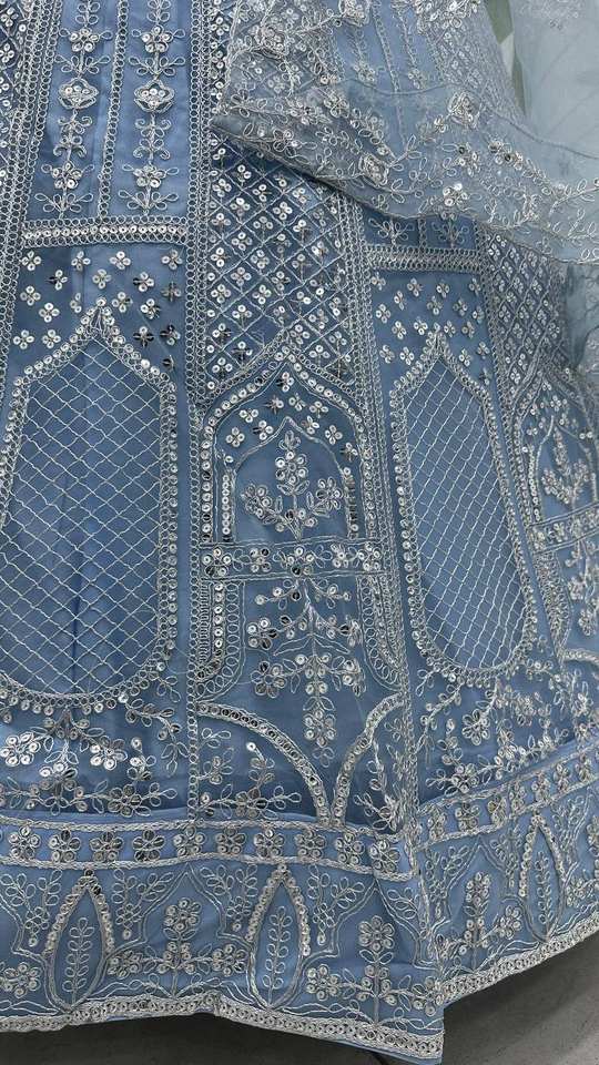ชุดเลเฮนกาโชลีผ้าตาข่ายลายผีเสื้อแบบอินเดีย ตกแต่งด้วยเลื่อมปักอย่างประณีต พร้อมผ้าคลุมไหล่ผ้าตาข่ายเนื้อหนา สำหรับเทศกาลดีวาลี ทำจากวัสดุรีไซเคิล