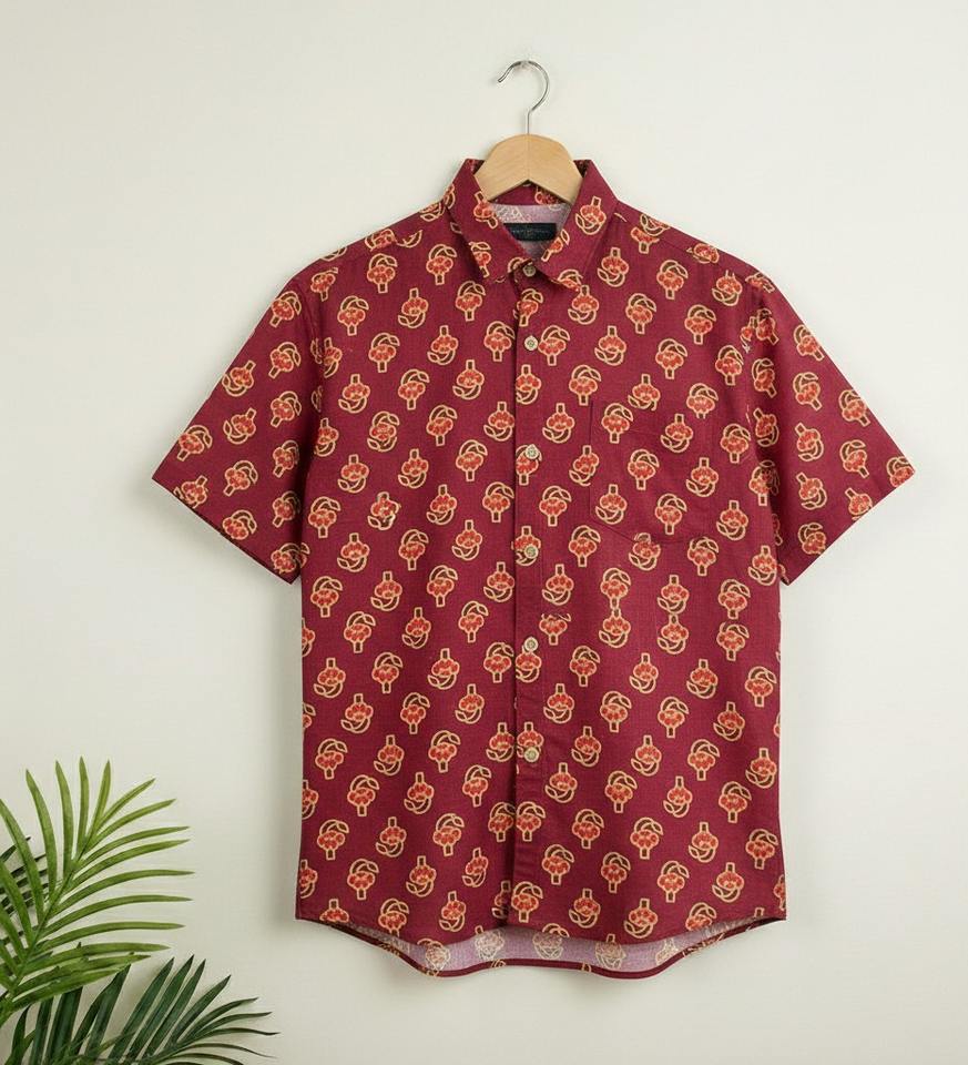 เสื้อเชิ้ตผู้ชายสไตล์โบโฮทำมือโดยดีไซเนอร์ชาวอินเดีย ผ้าฝ้าย 100% แขนครึ่งตัว เป็นมิตรกับสิ่งแวดล้อม ลายบาติกพิมพ์ลายทาง ระบายอากาศได้ดี เหมาะสำหรับฤดูร้อน