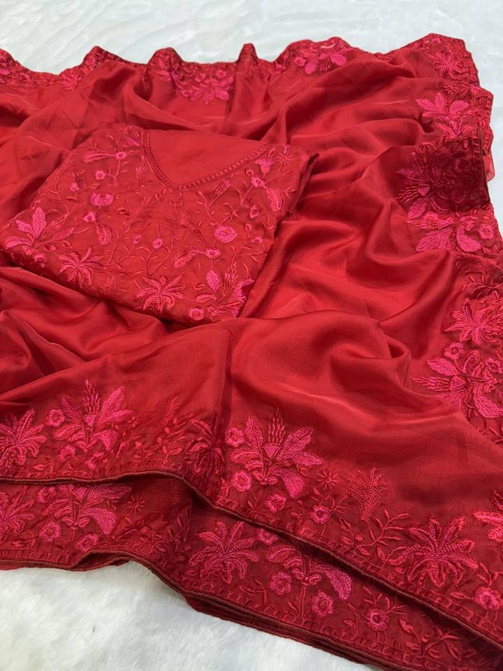 เสื้อสเวตเตอร์ผ้าออแกนสีแดงผ้าซาริปักลายเสื้อส่าหรีแบบชนเผ่าสุดพิเศษนำเทรนด์ล่าสุด