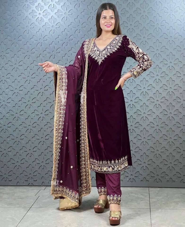 Viscose Velvet Thread Embroidery Top Pant And Dupatta