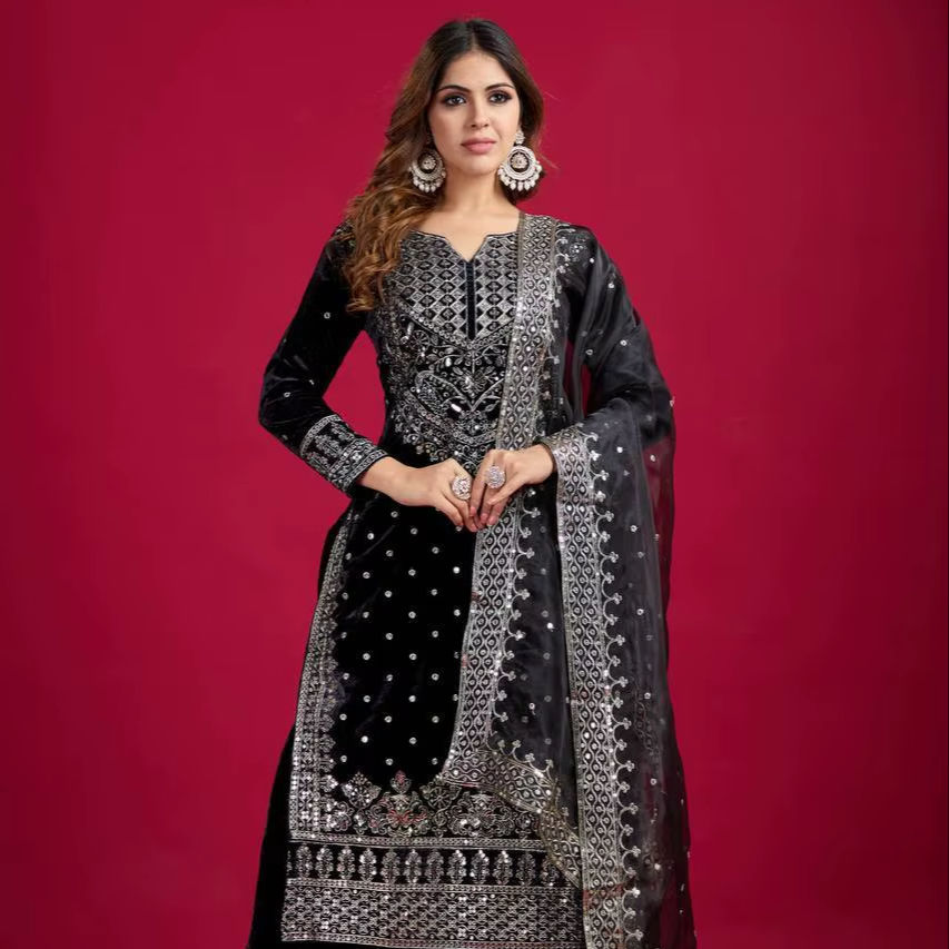 Indian Winter Traditional Dress New Designer Viscose Velvet Embroidery Sequence Work Top Sharara Dupatta Wine Wedding Party