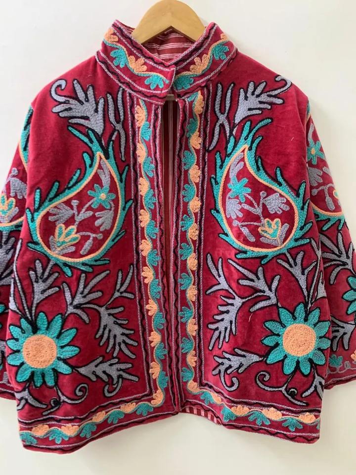 เสื้อแจ็กเก็ตกำมะหยี่สไตล์โบฮีเมียนของผู้หญิงปักลายดอกไม้