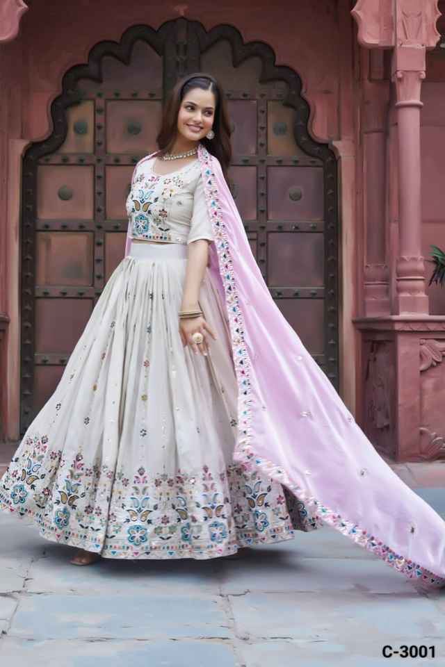 ชุดเลเฮนกาโชลีผ้าไหมแท้สไตล์อินเดีย ประดับด้วยงานปักเลื่อมและด้ายอย่างประณีต พร้อมผ้าคลุมไหล่ผ้าฟีนดี้แท้