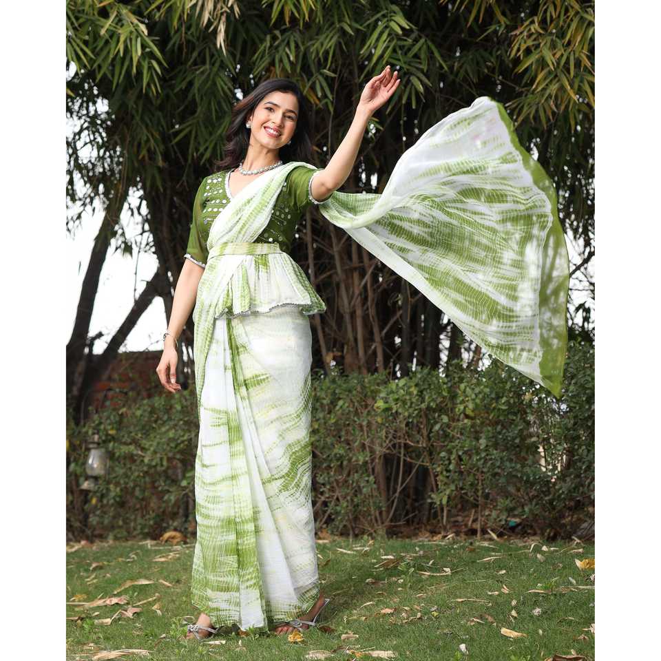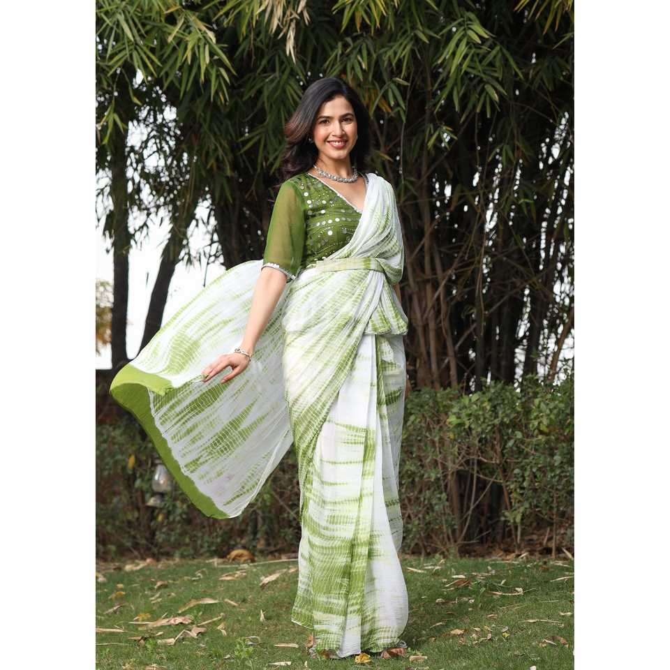ผ้าไหมส่าหรีจากผู้ส่งออกอินเดีย ลายพิมพ์มิเรอร์ไทดายสีเขียว วาดด้วยมือ แห้งเร็ว สำหรับผู้หญิง ส่าหรีสำหรับงานพิธีการ งานเฉลิมฉลอง