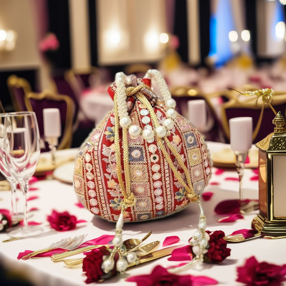 กระเป๋าถืองานแต่งงานสไตล์อินเดีย กระเป๋าปักลายแบบ Potli ประดับด้วยเลื่อมและมุกสำหรับเพื่อนเจ้าสาว