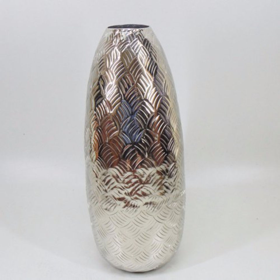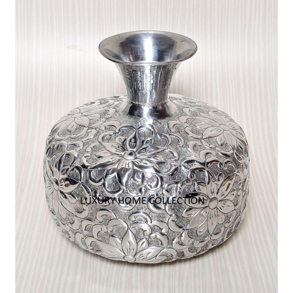 แจกันอลูมิเนียมสีเงินทำด้วยมือแจกันลายนูนออกแบบดอกไม้อินเดีย