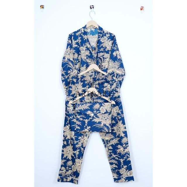 ชุดนอนผ้าฝ้ายพิมพ์ลายดอกไม้สไตล์อินเดียสำหรับผู้หญิง ระบายอากาศได้ดี แขนยาว กางเกงขายาว ชุดนอนฤดูร้อน เสื้อสองชิ้นแบบเข้าชุด