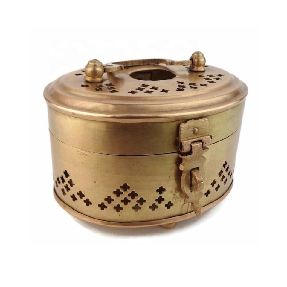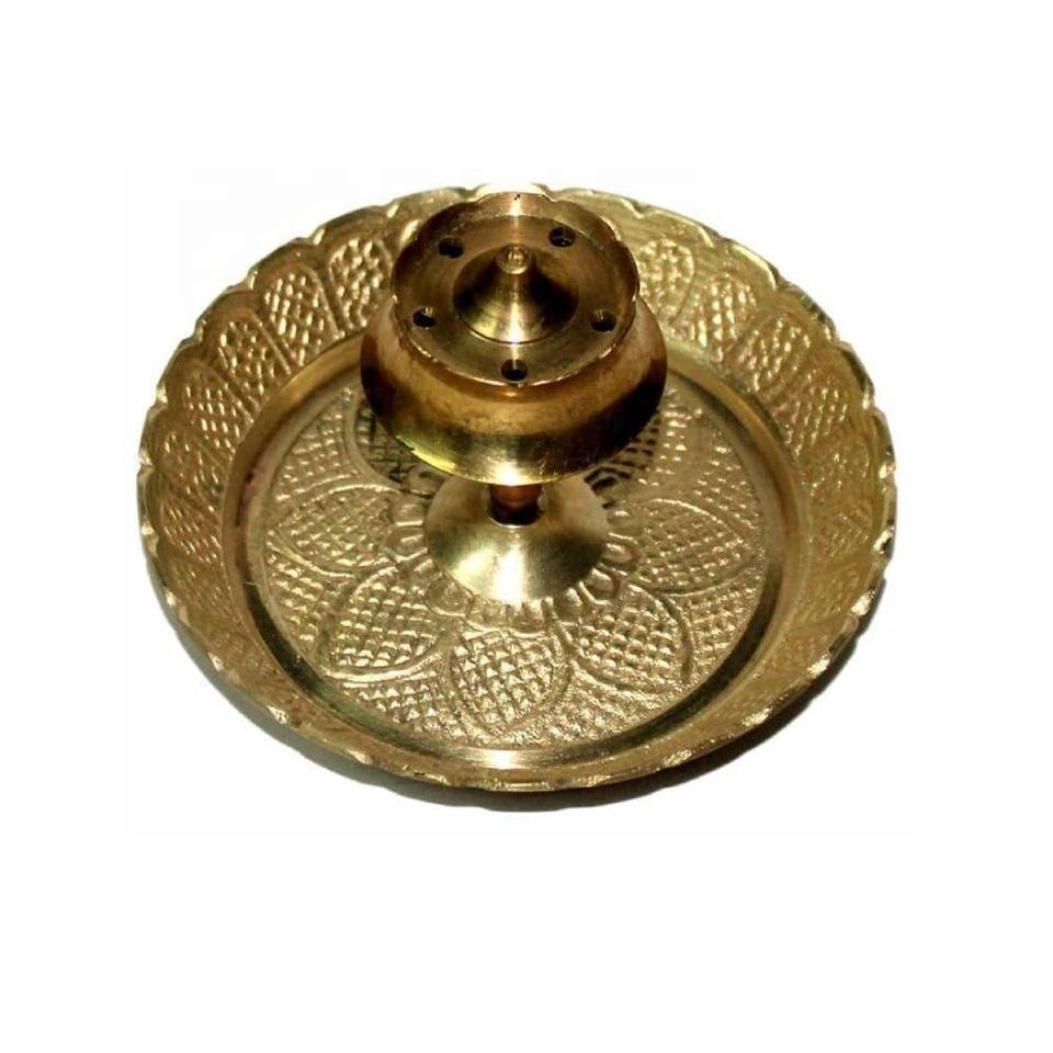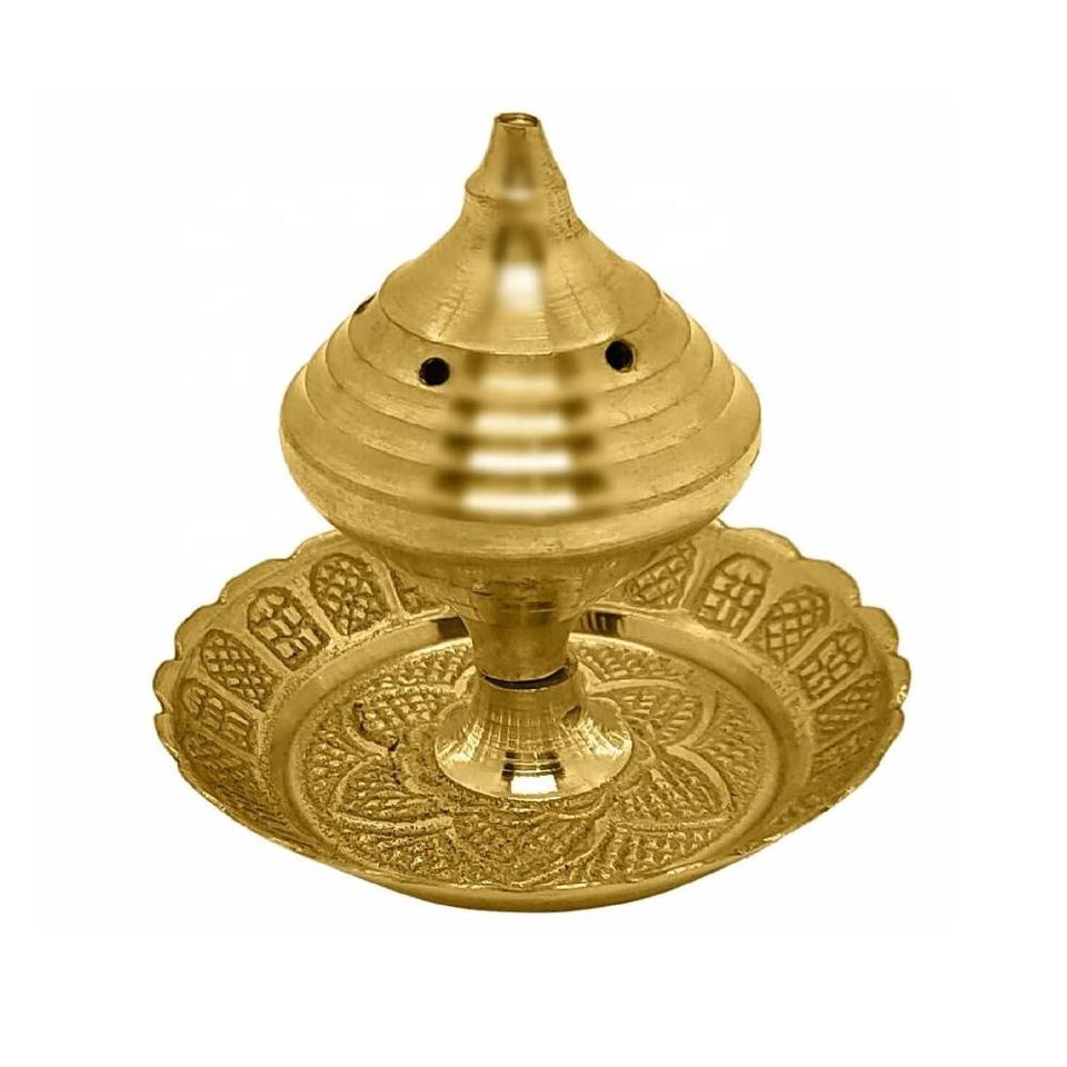 ที่ใส่ธูปจับทองเหลืองและแก้วสีทองอินเดียพร้อมจานสำหรับเทศกาล Puja Diwali วัดตกแต่งบ้าน