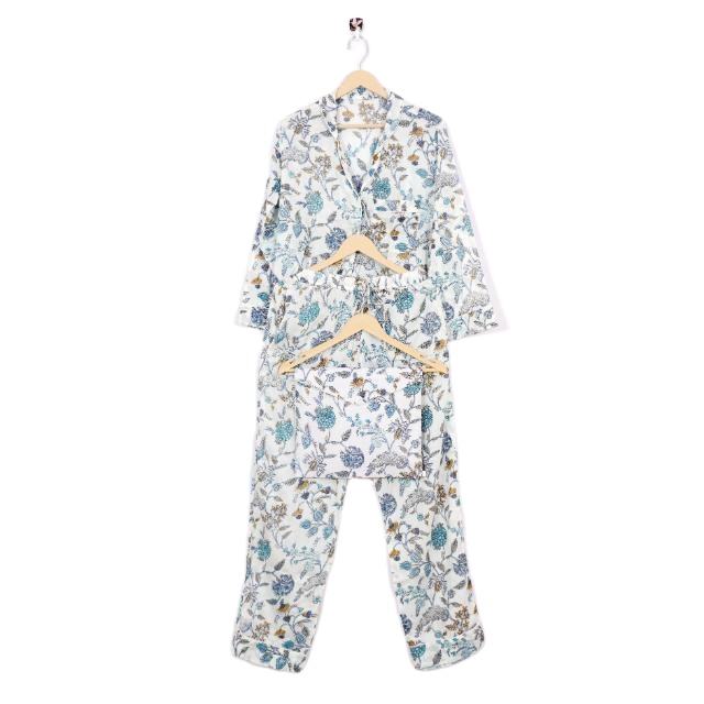 อินเดียมือบล็อกดอกไม้พิมพ์ผู้หญิงผ้าฝ้ายชุดนอนเซ็กซี่ชุดแขนยาวชุดราตรีฤดูร้อนสวมเสื้อและกางเกง PJ ชุด