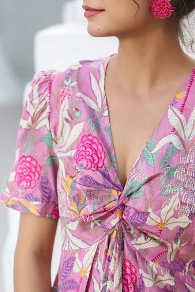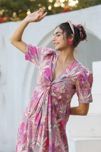 เดรสผ้าฝ้ายพิมพ์ลายดอกไม้สไตล์อินเดียเดรสลำลองฤดูร้อนสำหรับผู้หญิงสั้นสไตล์วินเทจพร้อมโลโก้หวานระบายอากาศ