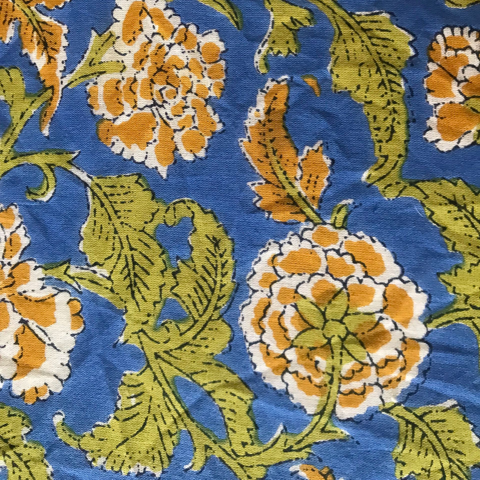 ผ้าฝ้ายพิมพ์ลายบล็อกอินเดีย ลายดอกไม้มัสตาร์ดและใบไม้สีเขียวบนพื้นสีน้ำเงินเข้ม