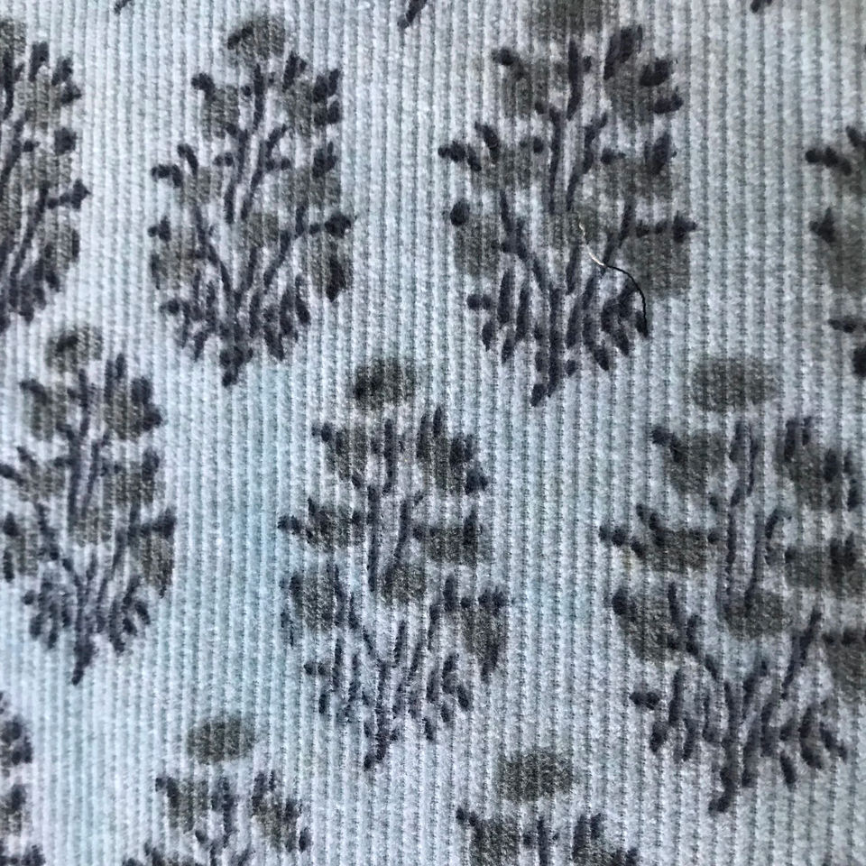 ผ้าฝ้ายพิมพ์ลายบล็อกอินเดีย ลายบูติสีเทาบนพื้นผ้าธรรมชาติ | สิ่งทอฝีมือชาวอินเดีย